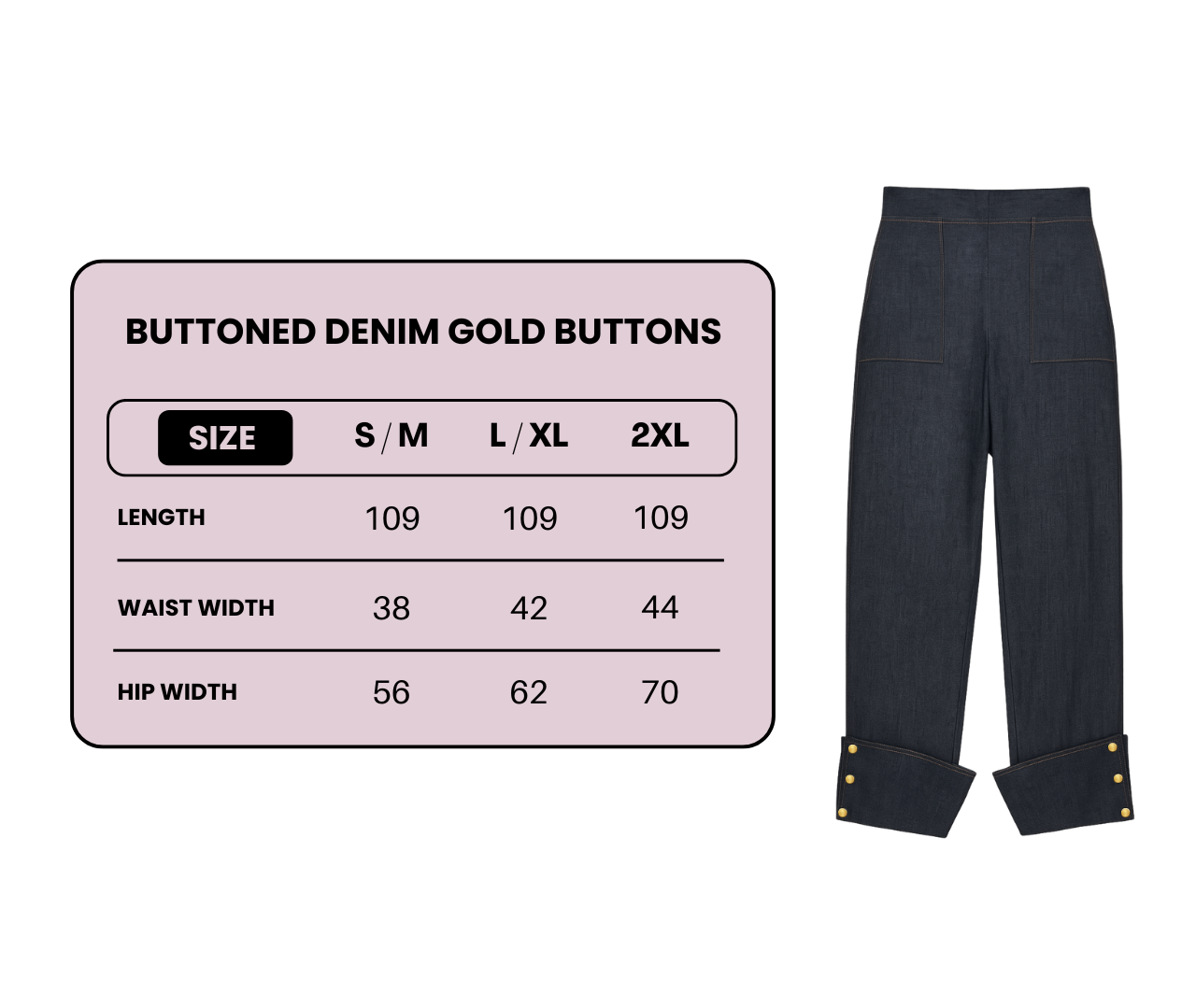 these Buttoned Denim Pants feature elegant button details at the hem, available in both gold and silver finishes. Designed for a flattering fit and easy styling, they’re the perfect pair for casual days or dressed-up looks.